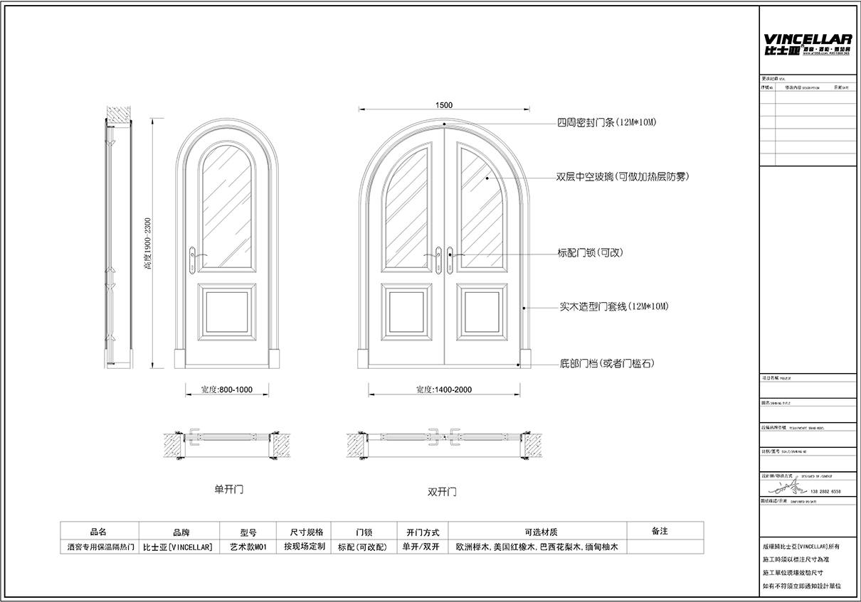 艺术系列玻木结合酒窖门尺寸设计与做法 艺术系列玻木结合酒窖专用保温隔热门,采用按现场定制模式,门可分为单开门(单开门尺寸宽度为800mm-1000mm,高度为1900mm-2300mm)与双开门(双开门尺寸宽度为1400mm-2000mm,高度为1900mm-2300mm),门页以双层中空玻璃或者三层中空玻璃上贴隔热膜防玻璃上挂雾珠,下部分为全实木内嵌保温层分别以欧洲榉木,美国红橡木,巴西花梨木,缅甸柚木四种材质做为外框及门框做法
